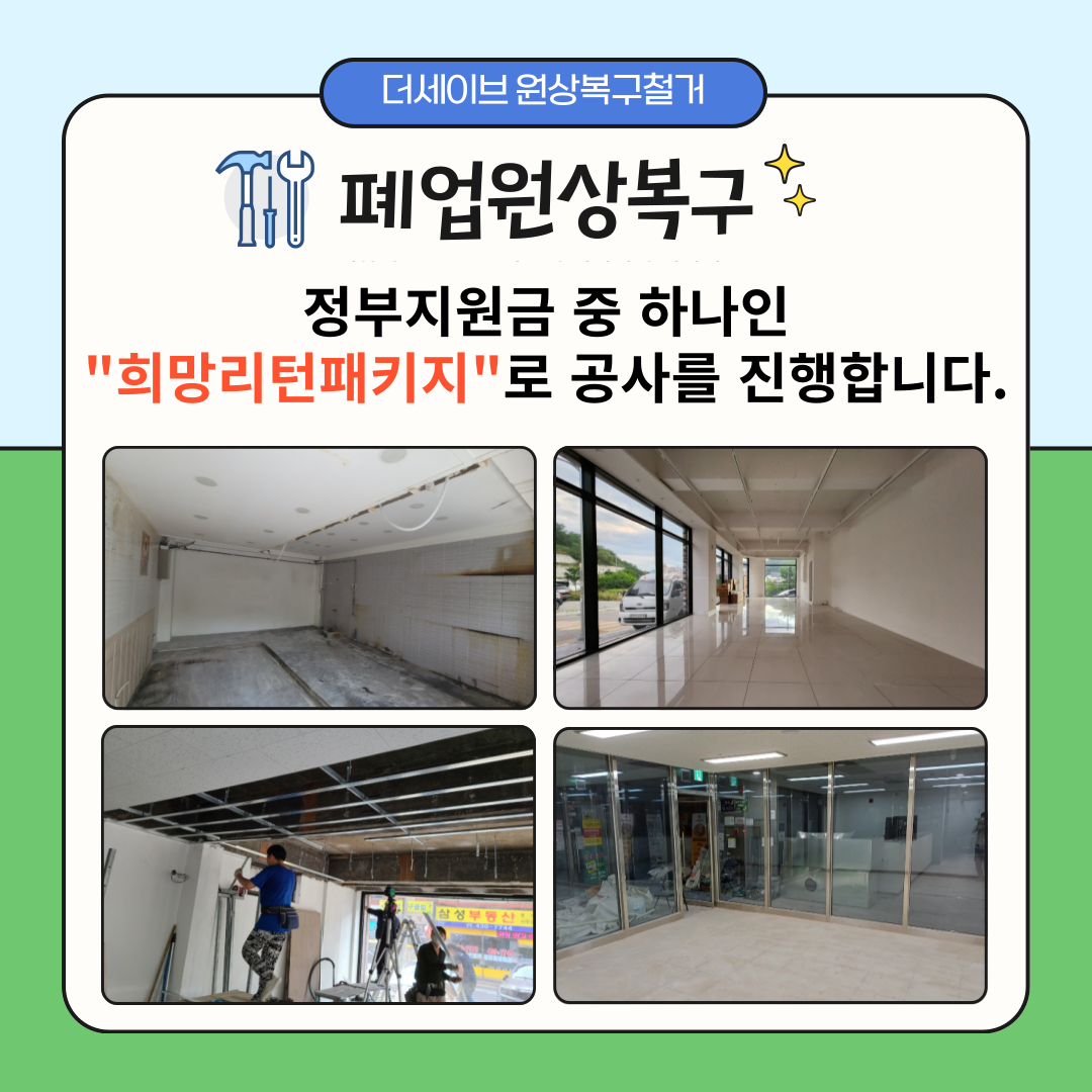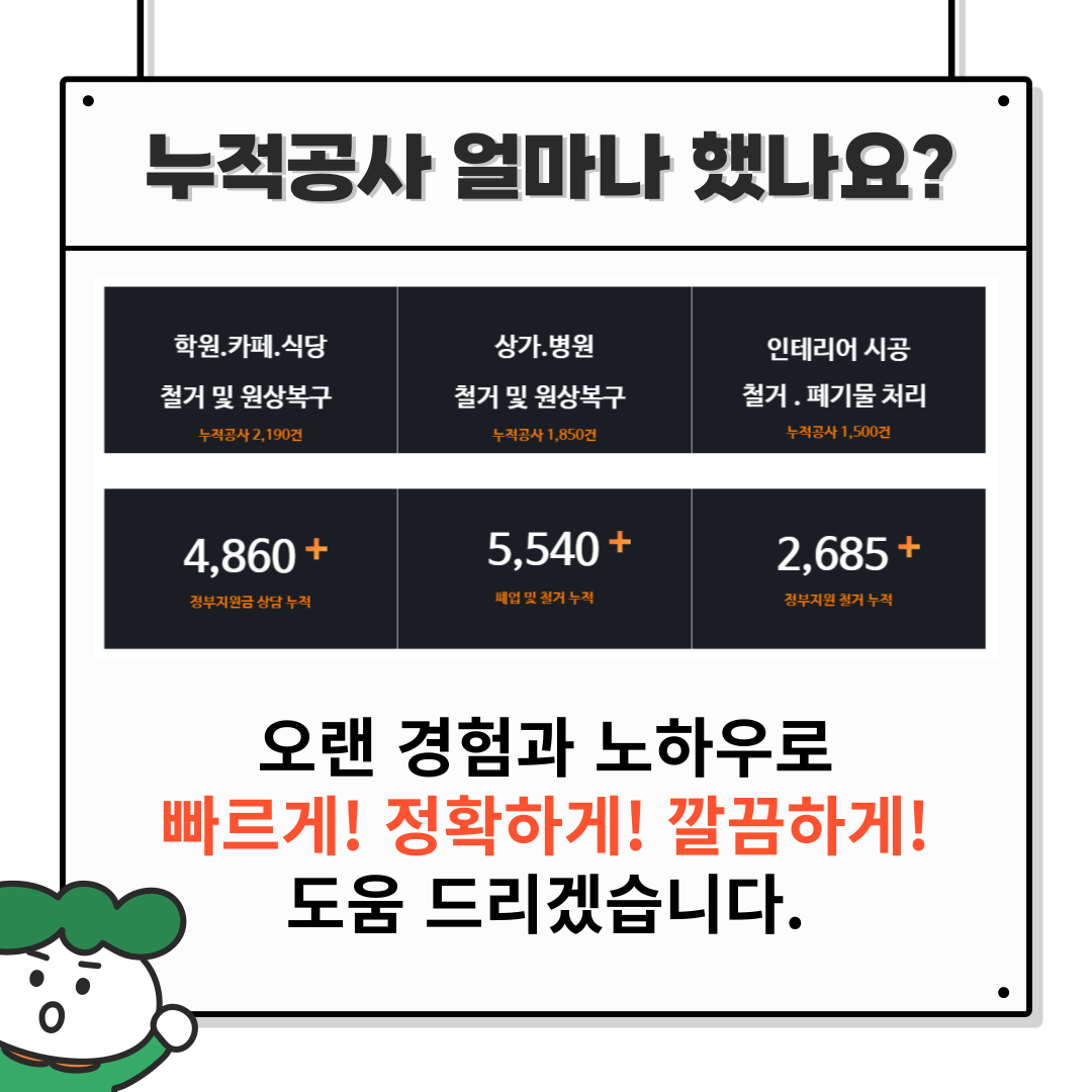 업체에서는 단순히 집기만 치우는 것이 아니라 벽면 페인트, 바닥재, 조명 철거까지 계약 조건에 맞게 원상복구를 도와주었고, 행정 서류까지 지원해 지원금 신청이 원활히 이루어졌습니다. 결과적으로 사장님은 최소한의 자부담만으로 폐업을 마무리할 수 있었습니다. 이 과정을 통해 단순히 비용 절감뿐 아니라 정신적인 부담까지 덜어낼 수 있었다는 점을 강조했습니다.